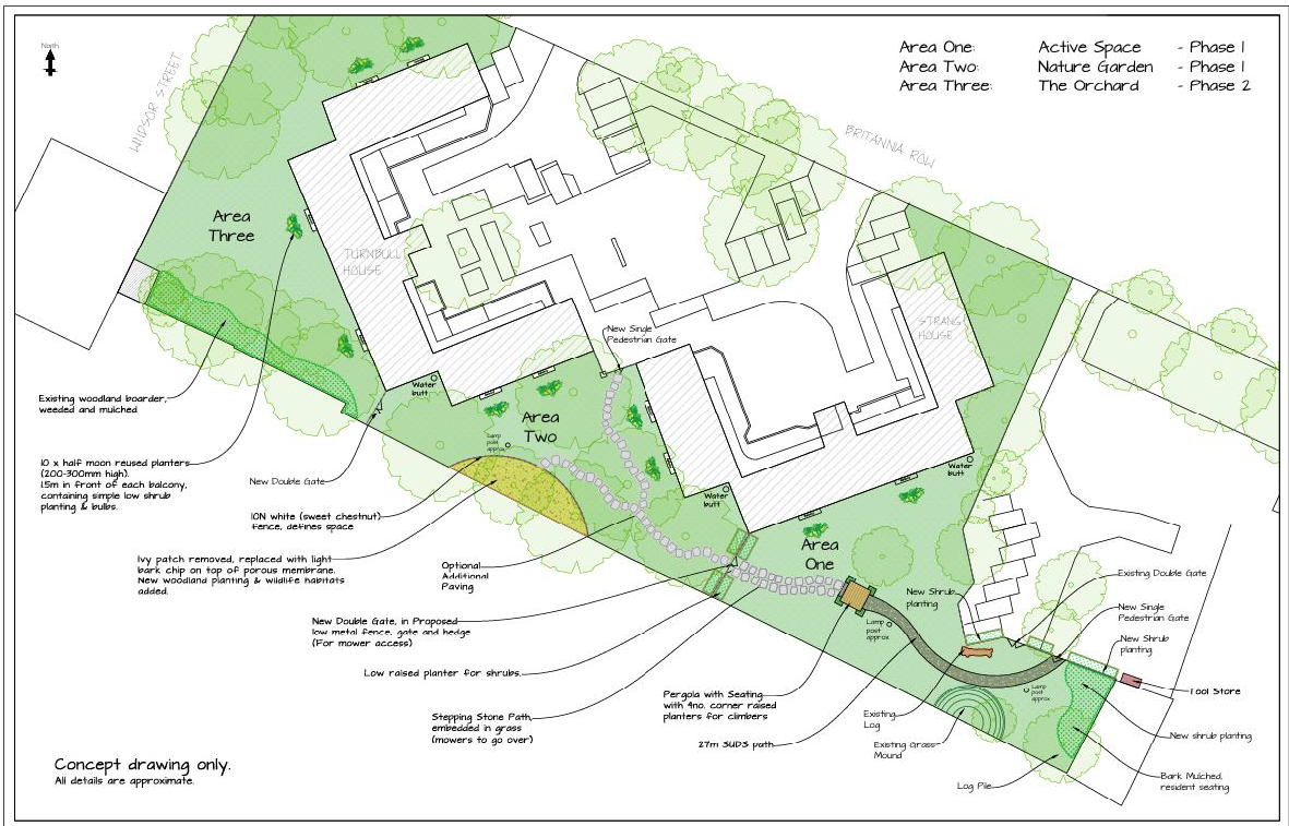 Following our online survey and drop-in session in September 2025, we have made changes to our proposals for the green space on Cummings Estate. The new proposals divide the space into three areas, delivered in two phases. Phase 1 would create an active space (area 1) and a nature garden (area 2). Phase 2 would create the orchard (area 3).