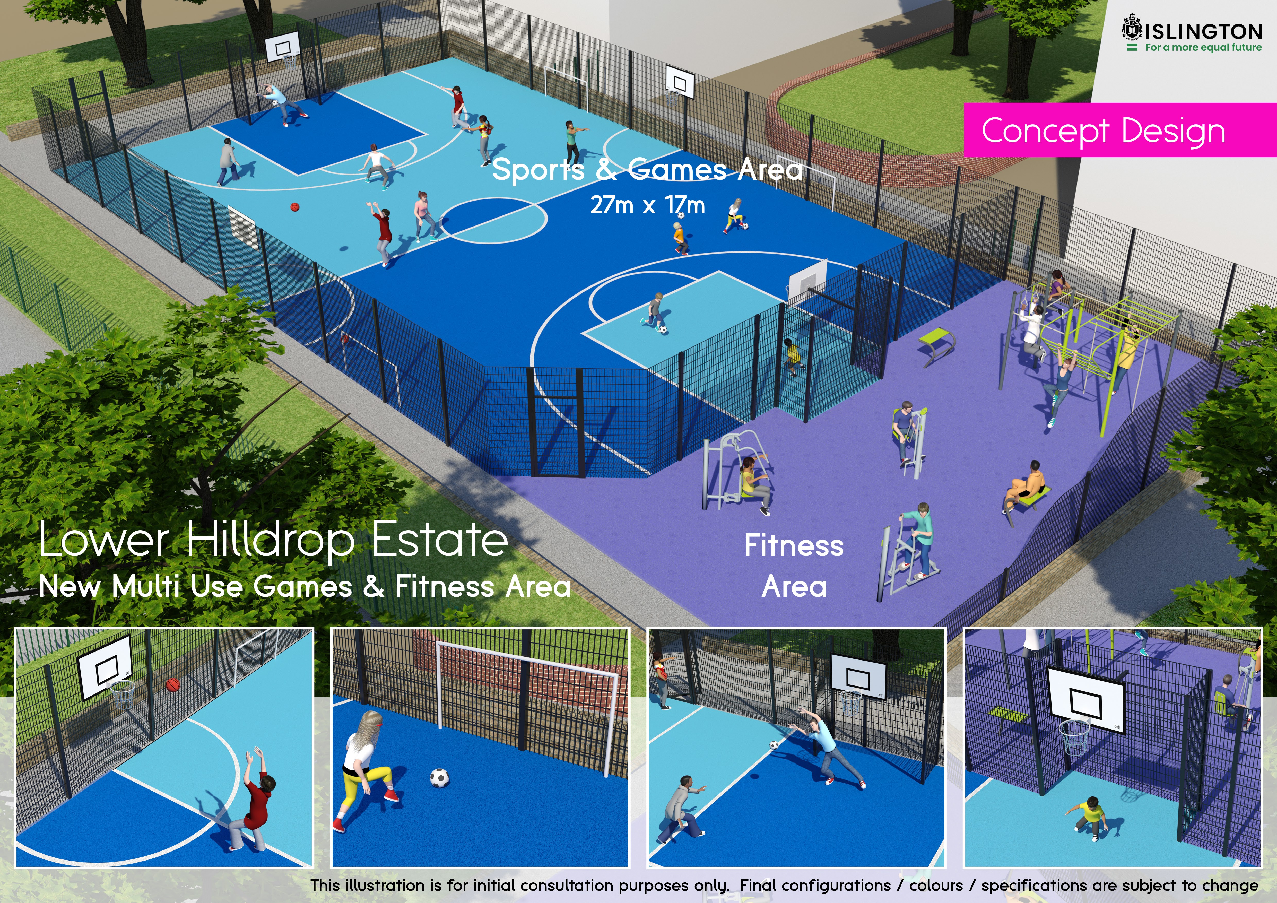Based on the feedback you gave us during the engagement campaign. The improvement work to Lower Hilldrop estate play areas and MUGA area: