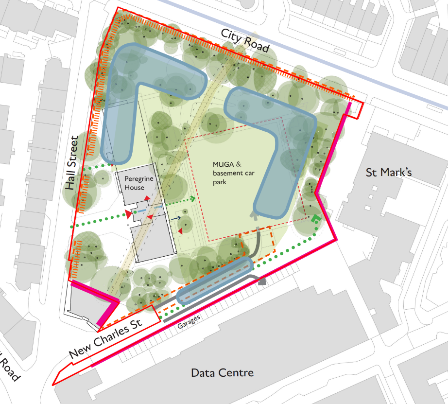 At this early stage, we are proposing to build new blocks facing City Road, Hall Street and St. Marks. The block to Hall Street would replace the Peregrine House Annex building.