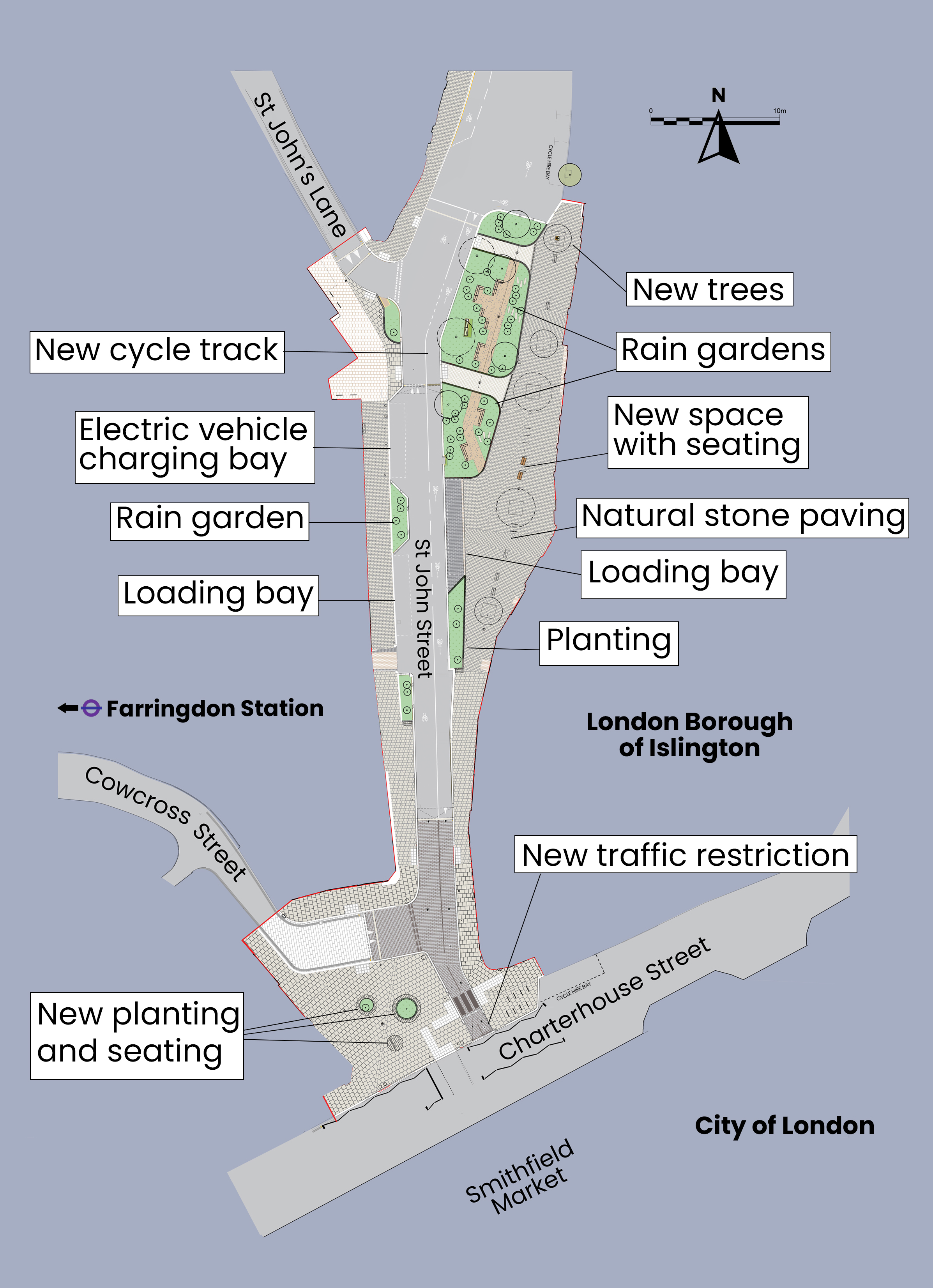- Starting from 1 September 2025, there will be no access travelling southbound from St John Street to Charterhouse Street or to St John’s Lane. Advanced warning signs will alert motorists of the closure. Northbound access will be maintaned.