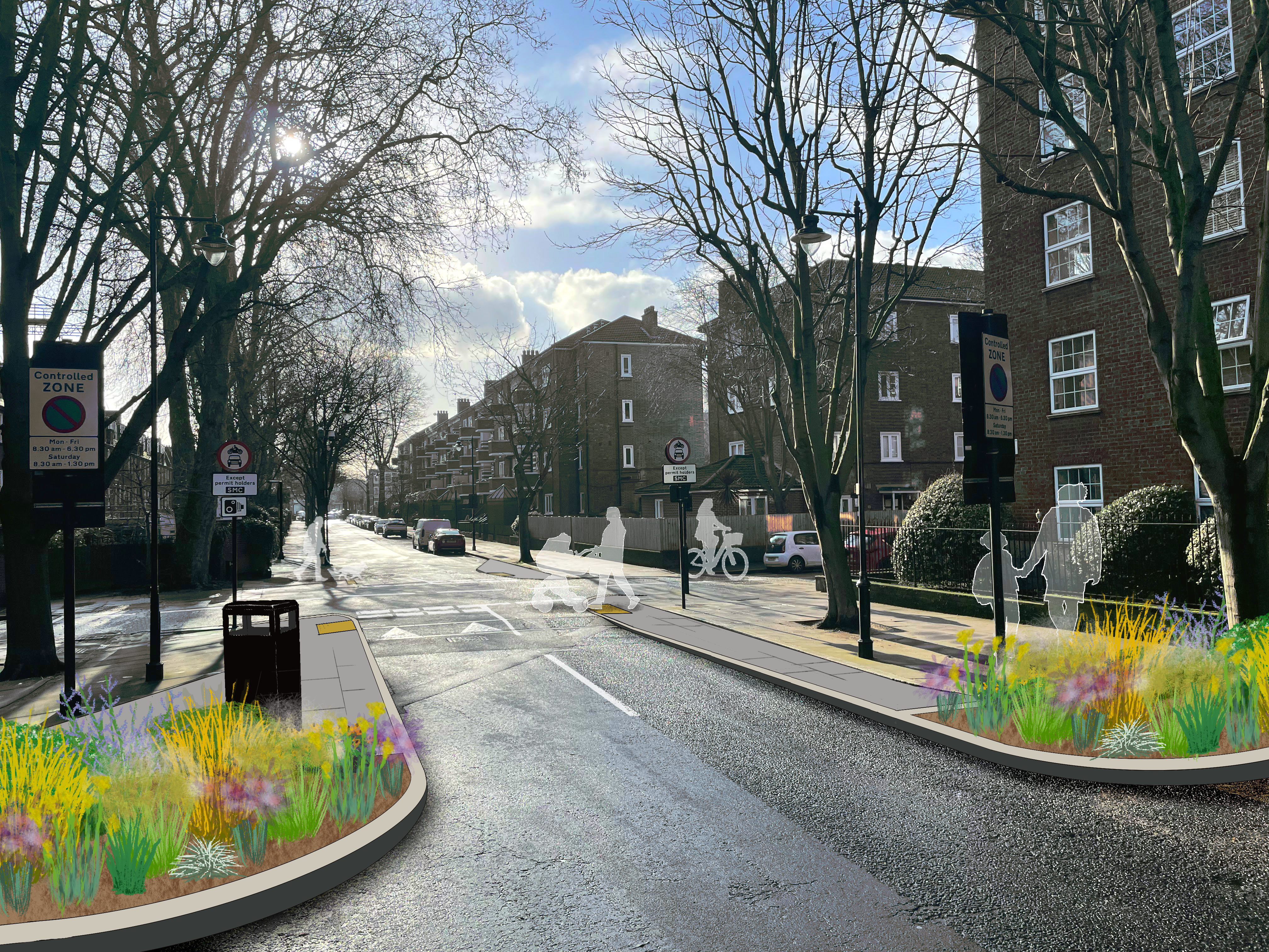 - Replace the existing zebra crossing with an improved informal crossing and widen the pavement here to make crossing easier