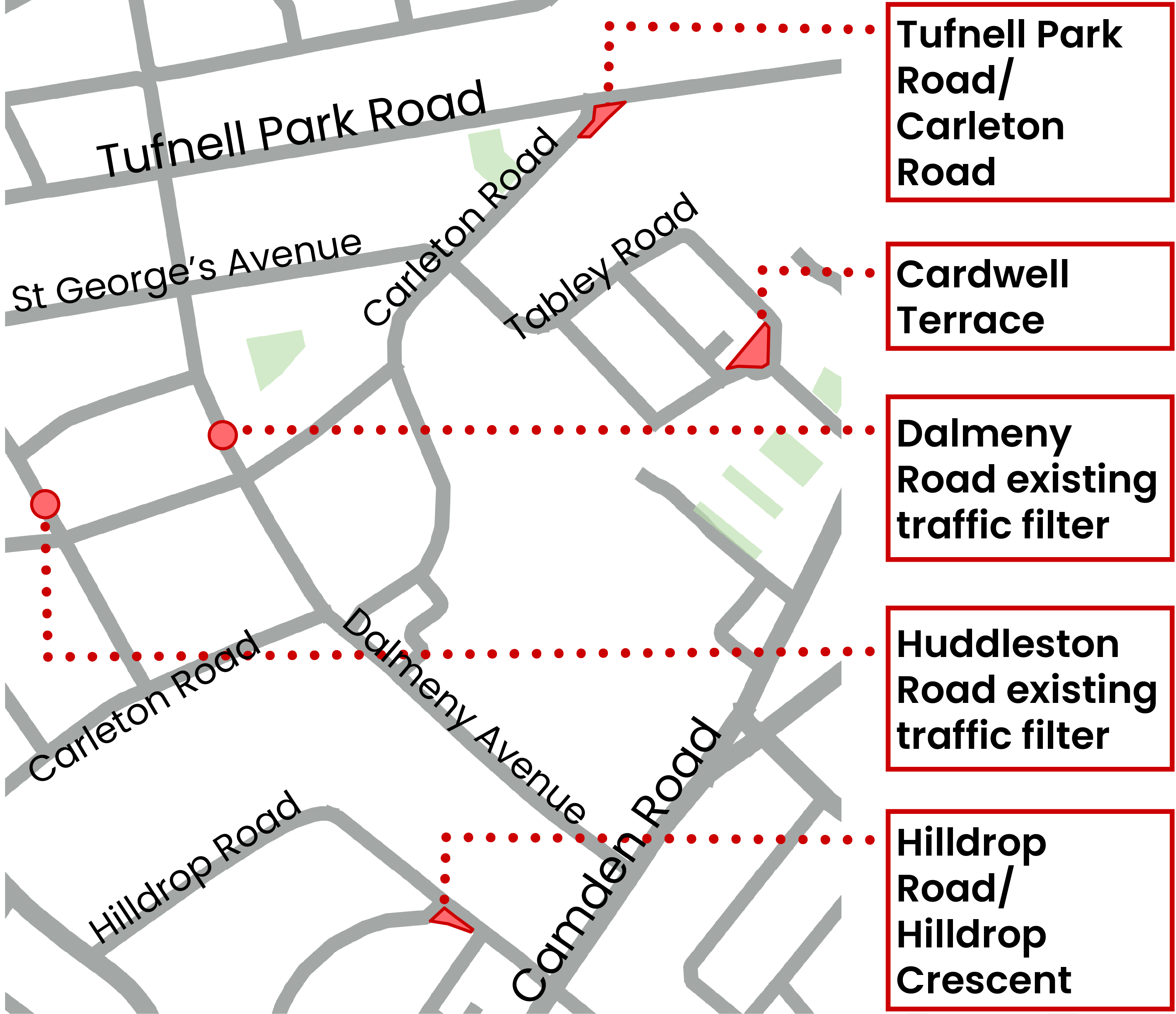 Our public engagement on greening and other improvements to the existing school street on Carleton Road and Dalmeny Road outside Tufnell Park Primary School and The Bridge Secondary School ran from Monday, 7 July to Monday, 21 July 2025.